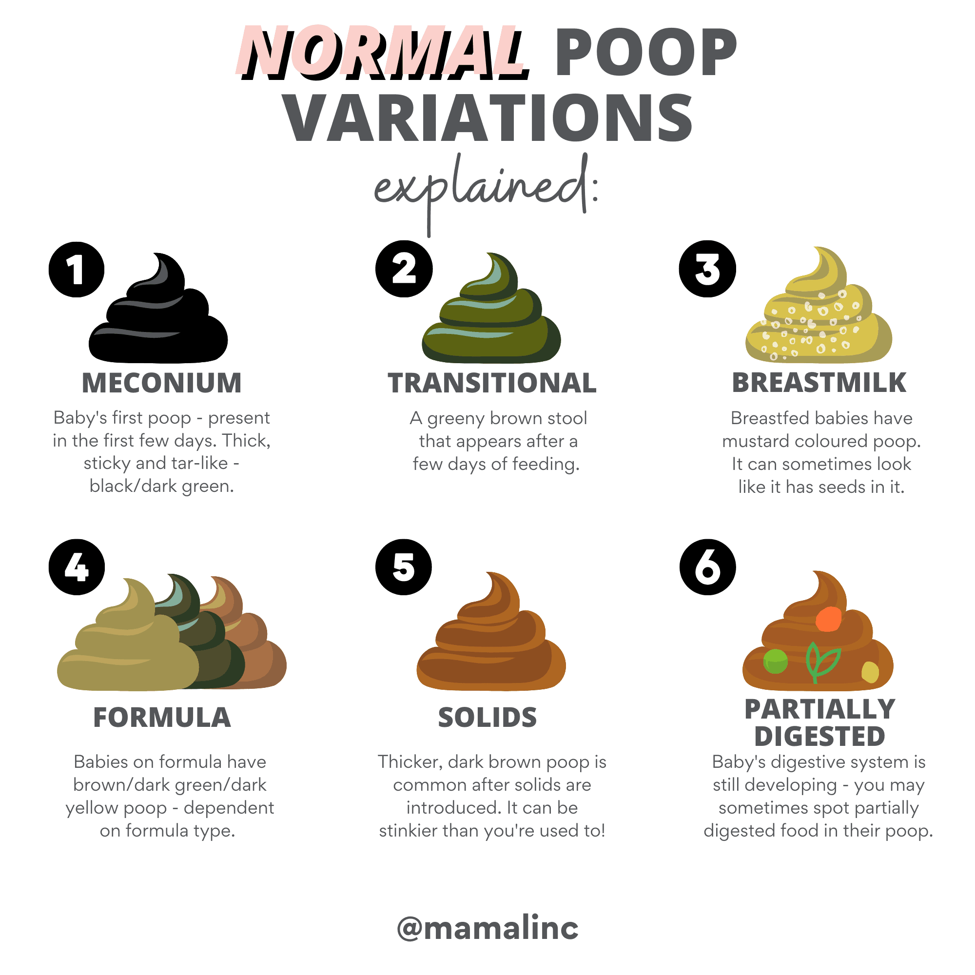 After a day or two of transitional poop, you can expect that you baby will start to have regular baby poop – for breastfed babies, this can have a mustard colour and sometimes look like it has seeds (fat globules) in it. For formula fed babies, the colour can range from brown/dark green/dark yellow – depending on the formula type.
